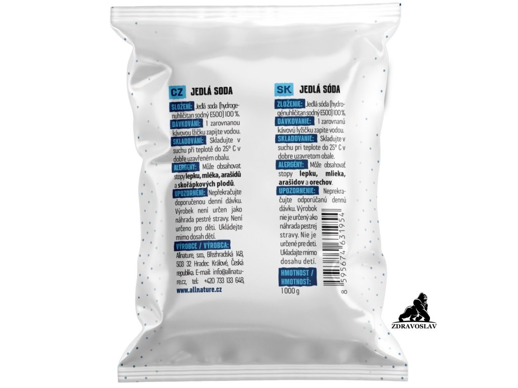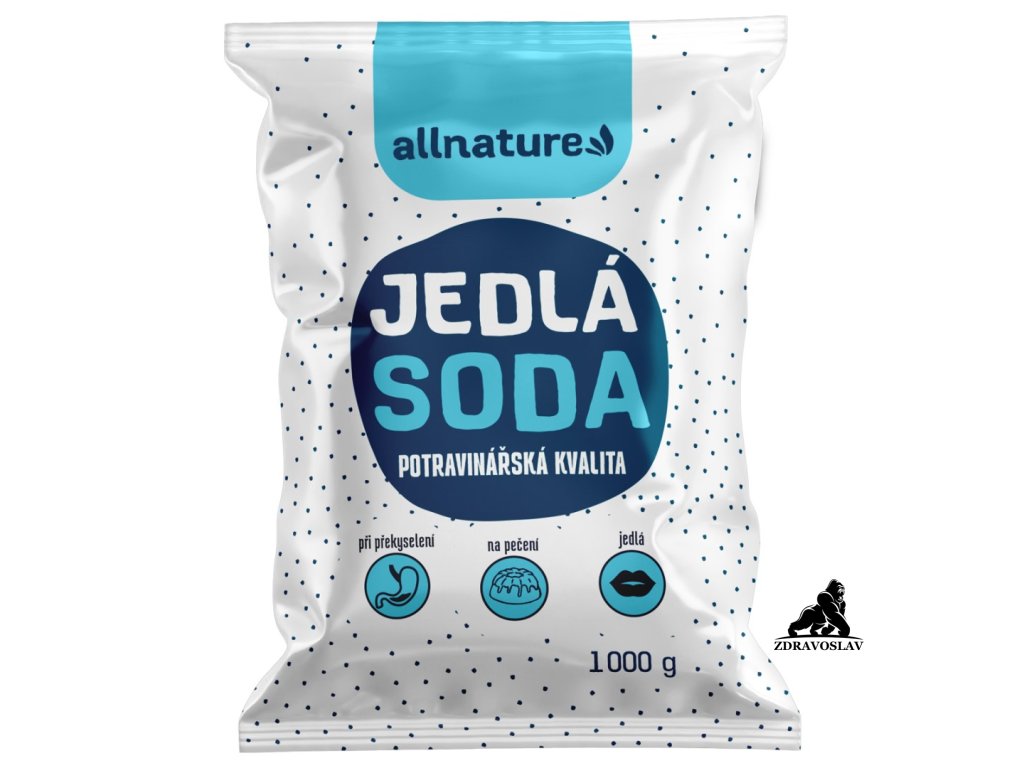 Allnature Jedlá soda je všestranný pomocník, který lze využít během úklidu domácnosti i při každodenní hygieně. Působí zásaditě, může pomoci při překyselení žaludku a pálení žáhy. Odstraňuje pigmenty a usazeniny na zubech. Čistí usazené nečistoty a mastnotu, na praní prádla.