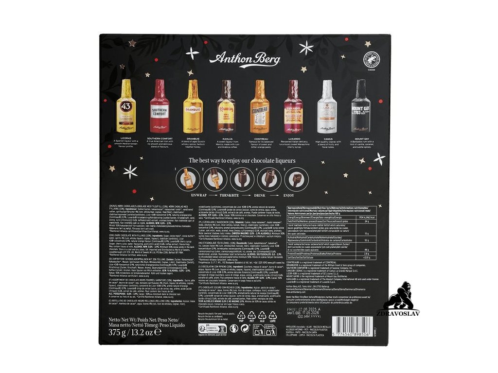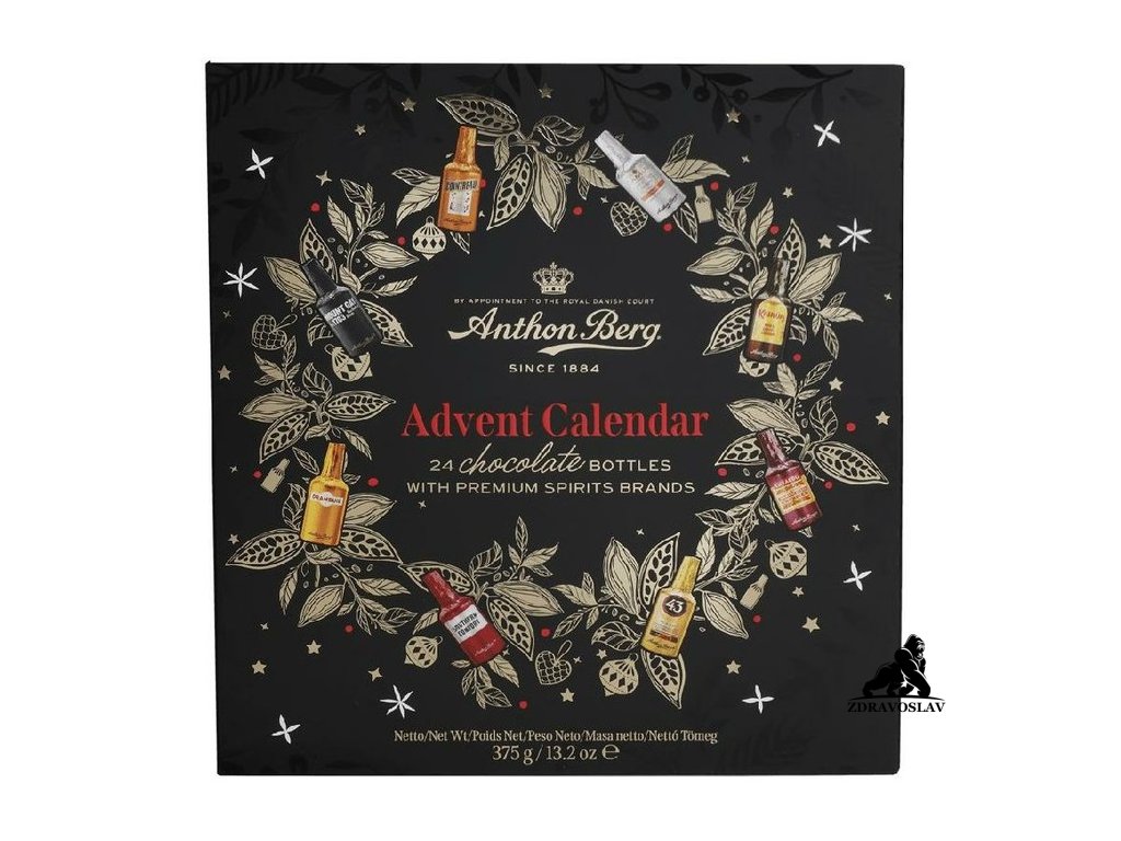 Anthon Berg Liqueurs Advent Calendar 375 g přináší elegantní a gurmánský zážitek na každý prosincový den. V krásně ilustrované dárkové kazetě najdete 24 mini lahviček z hořké čokolády (min. 50 % kakaové sušiny), každá naplněná autentickým, tekutým likérem světových značek jako The Famous Grouse, Cointreau, Drambuie, Jim Beam, Rémy Martin či Canadian Club.