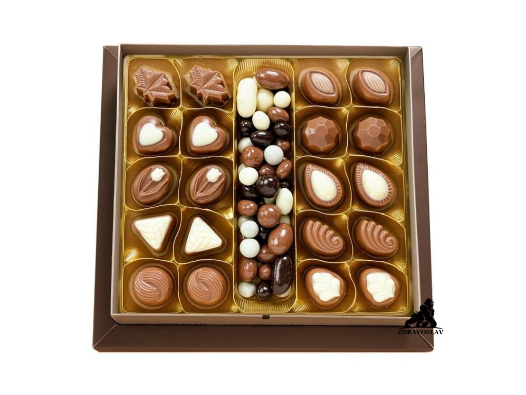 Složení: Mléčná čokoláda, hořká čokoláda, bílá čokoláda, nugát Gianduja (lískové ořechy / mandle), ganache náplně (různé příchutě – citron, cappuccino, pomeranč, jahoda, karamel…), krokant, dražé s ořechy/pistáciemi/rozinkami/kandovaným ovocem apod.