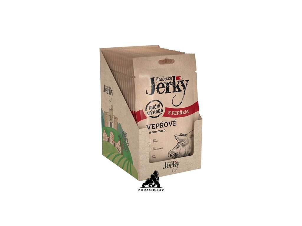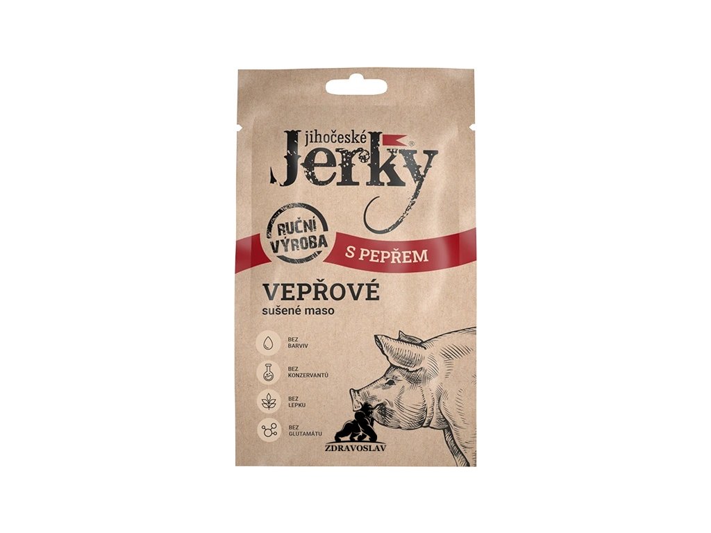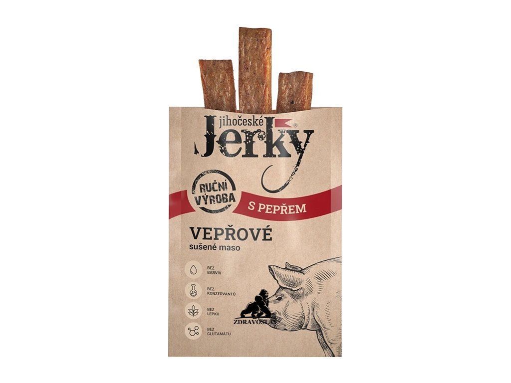 Jihočeské Jerky vepřové s pepřem představují chutnou a praktickou masovou svačinu s výrazným charakterem. Tenké plátky kvalitního vepřového masa jsou ochuceny aromatickým pepřem a následně pomalu sušeny, aby si zachovaly svou přirozenou chuť, pevnou strukturu a nutriční hodnoty.