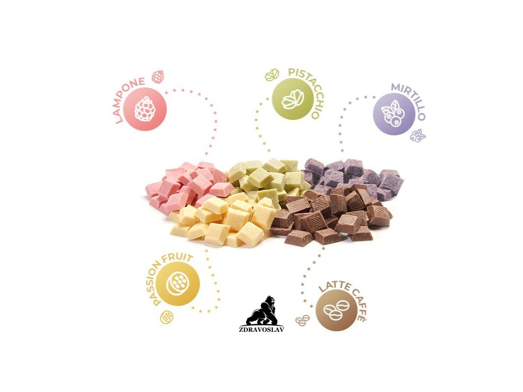 Díky použití dehydrovaného ovoce je dosaženo excelentní chuti, která v sobě nese kombinaci jemné bílé čokolády a výrazné maracuji.