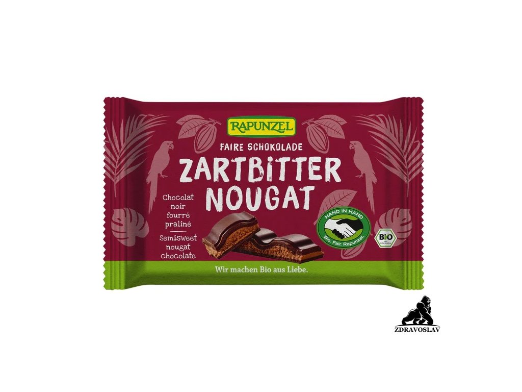Rapunzel BIO hořká čokoláda s nugátem je dokonalým spojením kvalitní hořké čokolády a lahodné nugátové náplně s podílem lískových oříšků 18 %. Je vyrobena z těch nejlepších surovin v BIO kvalitě a slazena pouze přírodním třtinovým cukrem, bez použití rafinovaných cukrů nebo umělých sladidel.