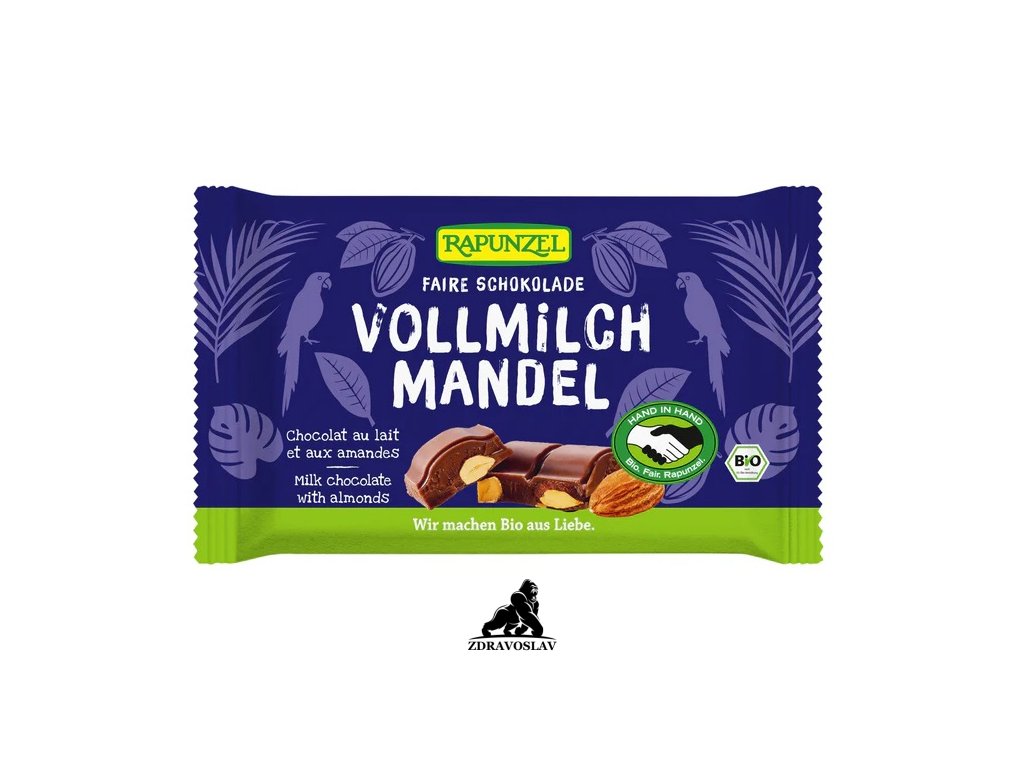 Rapunzel BIO mléčná čokoláda s mandlemi je dokonalým spojením jemné mléčné čokolády s obsahem kakaové sušiny min. 34 % a celých mandlí (18 %), které jí dodávají příjemnou křupavost a ořechovou vůni.