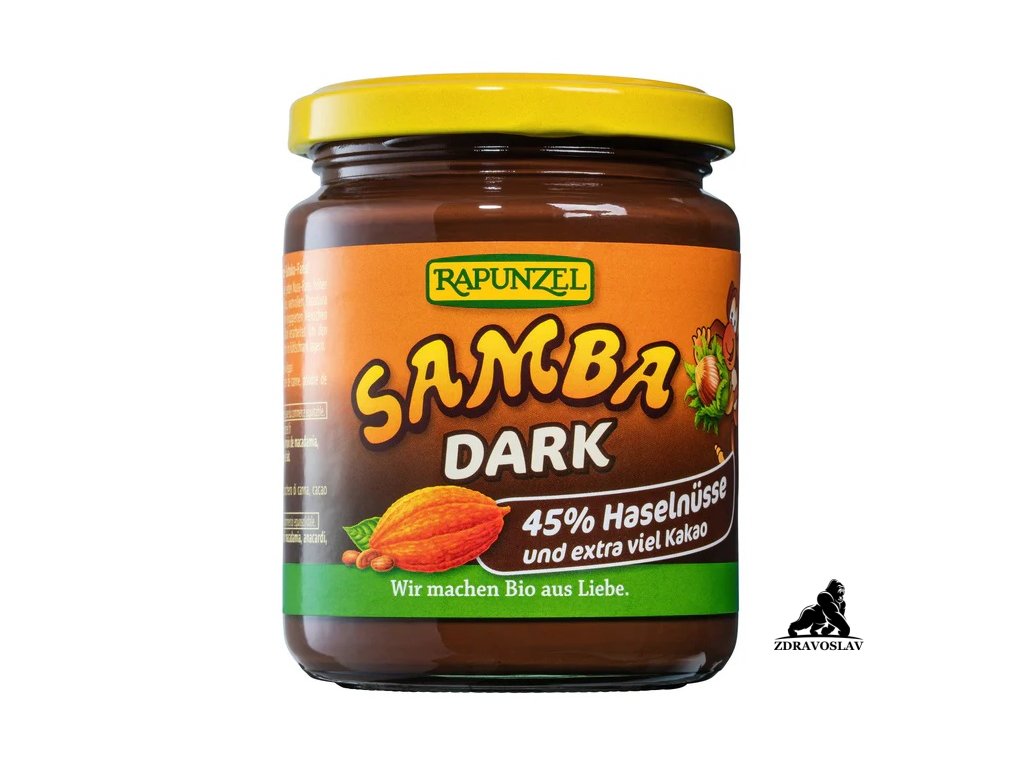 Pomazánka oříšková SAMBA Dark BIO 250 g od značky Rapunzel je vynikající volbou pro milovníky plné oříškové chuti s nádechem kakaa. Obsahuje 45 % šetrně pražených mletých lískových oříšků a 15 % kakaa. Sladidlem je sušená třtinová šťáva Rapadura a přírodní třtinový cukr, celek je ovoněn pravou Bourbon vanilkou.