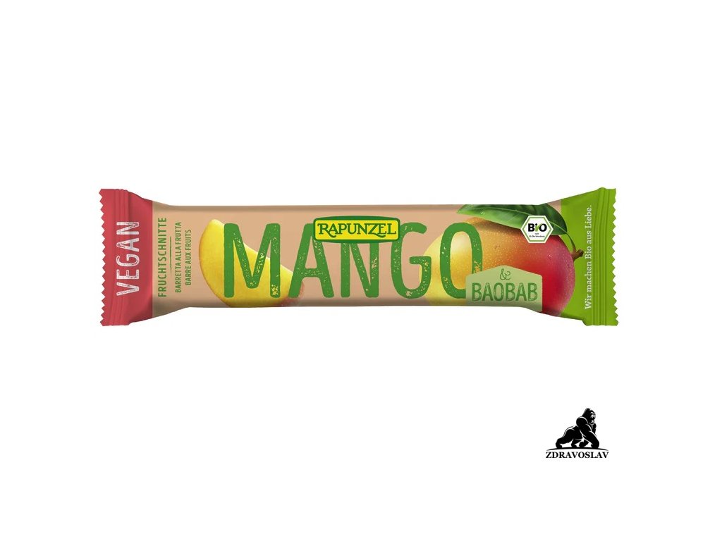 Rapunzel Tyčinka mango‑baobab BIO je čistě rostlinná svačinka z lisovaného ovoce, složená z datlí (49 %), sušeného manga (22 %), rozinek s rýžovým sirupem, slunečnicovým olejem a 2 % baobabové dužiny. Oplatková vrstva z bramborového škrobu udržuje tyčinku kompaktní a prakticky ji lze konzumovat bez špinění rukou. Tyčinka je jemně dochucena pravou Bourbon vanilkou. Tento produkt je raw, vegan, bez přidaného cukru a bez lepku. Je skvělým zdrojem rychlé energie pro výlety, sport i školní svačiny; sladká chuť manga je lehce vyvážena jemně kyselým tónem baobabu.