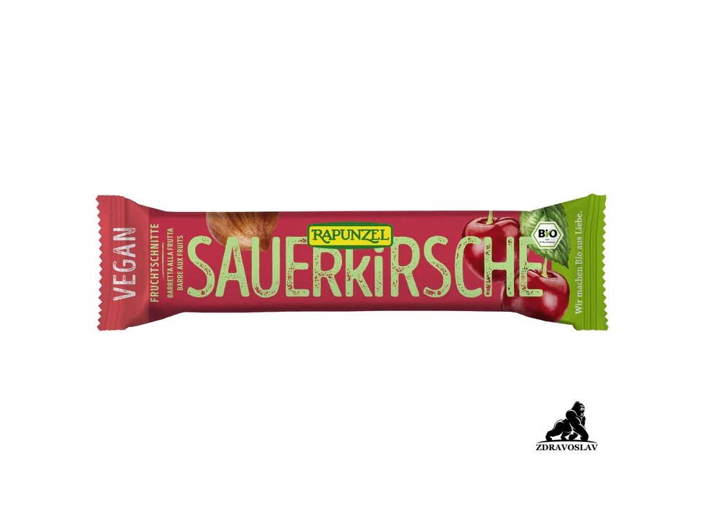 Rapunzel Tyčinka višeň BIO je čistě přírodní ovocná svačinka z lisovaného sušeného ovoce, jehož základem jsou rozinky sultánky (51 %) a sušené višně (17 %). Tyčinku doplňují přírodní datle, sirup z kokosových květů a jemně pražené lískové oříšky (5 %), vše bezpalmotové a v BIO kvalitě. Kompaktní plátková forma v oplatce z bramborového škrobu umožňuje pohodlnou konzumaci bez nepořádku. Tyčinka nabízí osvěžující kyselou chuť višně v harmonii s oříškovým aroma a přirozenou sladkostí ovoce.
