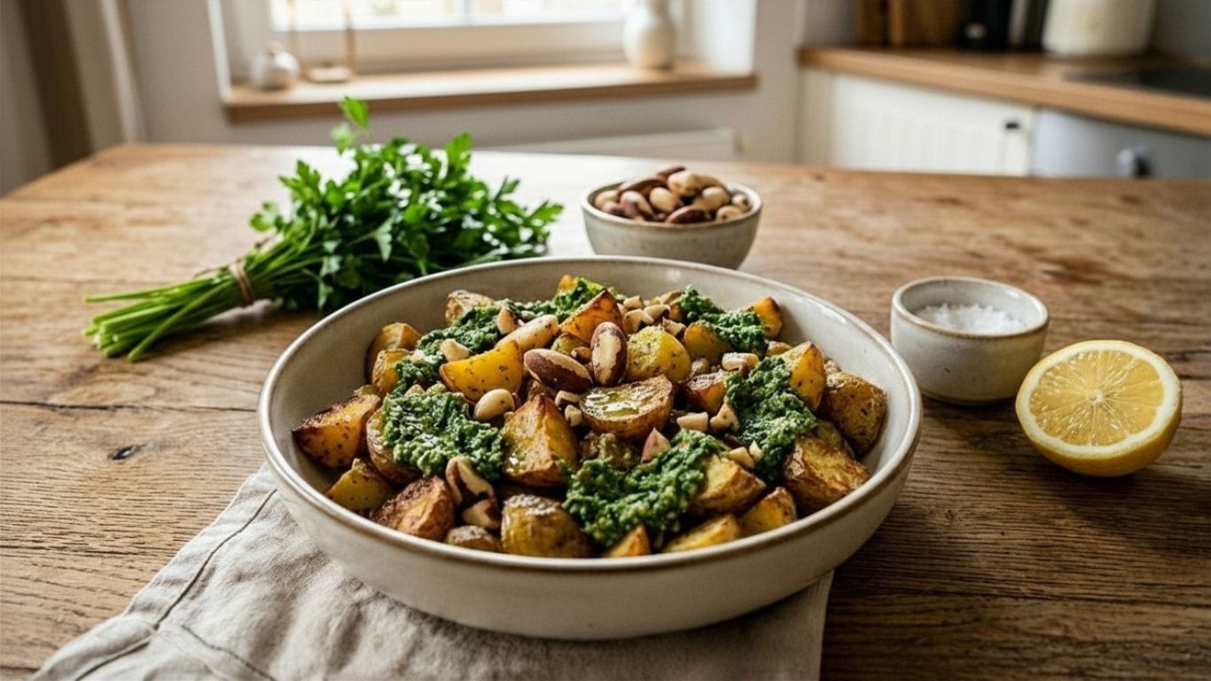 Chutný a snadno připravitelný bramborový salát s přídavkem brazilských ořechů.