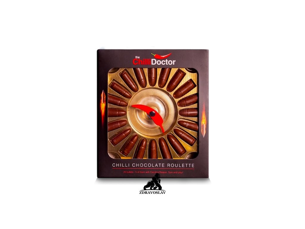 Zahrajte si Chilli Čokoládovou Ruletu! Pravidla jsou jednoduchá a zábava je zaručena. V balení najdete 20 čokoládových kousků ve tvaru „nábojů“, z nichž 5 skrývá intenzivní pálivost Carolina Reaper chilli.