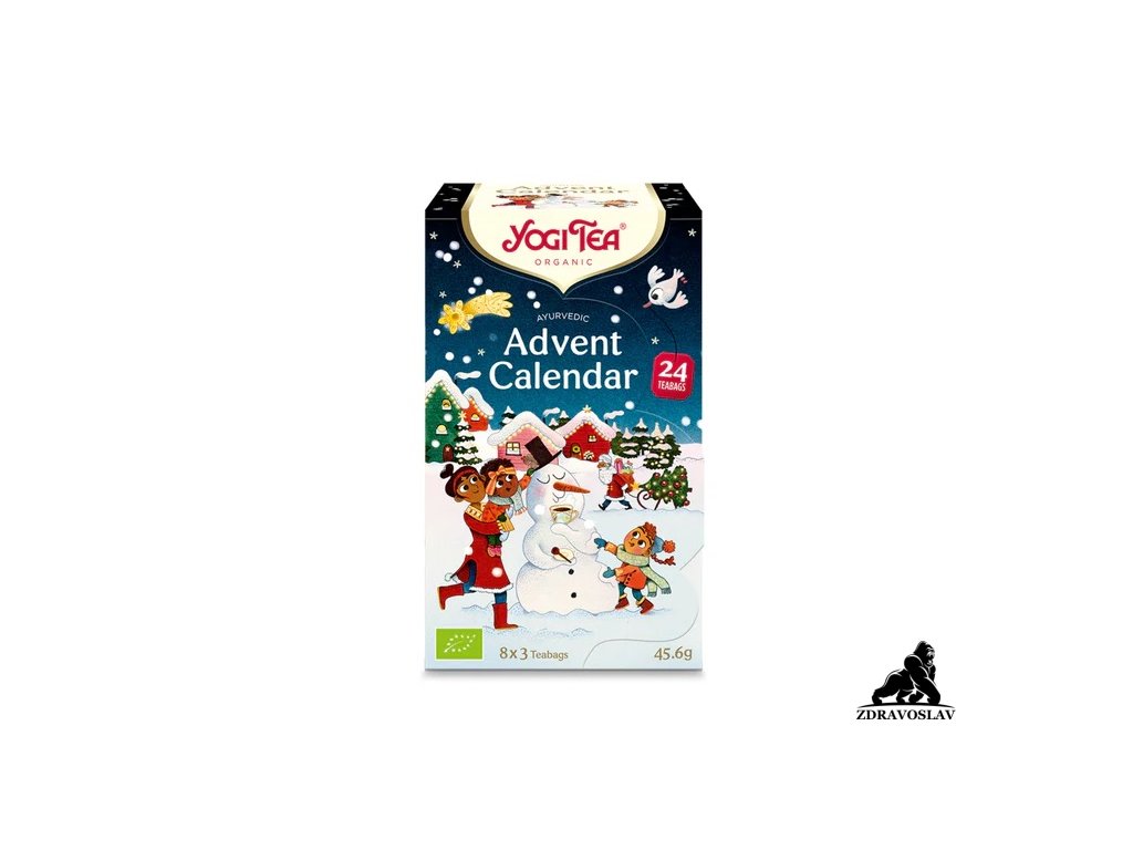 Tento čajový adventní kalendář s krásným barevným vánočním designem obsahuje celkem 24 sáčků oblíbených čajových směsí YOGI TEA®. V balení postupně najdete 24 druhů čajových směsí po jednom sáčku: Skvělý způsob, jak ochutnat vícero druhů čajů a vybrat si ten, který nás nejvíce osloví. Pro čaje obecně platí, že ekologický původ je u nich velmi důležitý. Jedná se totiž o potravinu, kterou konzumujeme bez oplachování, a veškerá residua pesticidů používaných při konvenčním pěstování tak zůstávají v čaji a mohou přejít do nálevu.. Příběh YOGI TEA®:. Ajurvéda, starodávný systém vědomého a zdravého života, vznikla v Indii před více než pěti tisíci lety. Na Západě, kde byla poprvé představena koncem šedesátých let minulého století, se často označuje jako nauka o životě (Ajur = život, Véda = věda nebo nauka). V roce 1969 začal na Západě učit jógu Yogi Bhajan, mistr Kundaliny jógy a inspirativní učitel ajurvédy a celostního přístupu k životu. Se svými studenty sdílel moudrost, znalosti zdravého života a přínos vybraných bylin a koření, zatímco jim podával zklidňující voňavý kořeněný čaj, kterému začali studenti láskyplně říkat Yogi Tea (neboli jogínův čaj). I dnes můžete najít stejnou inspiraci v každém šálku YOGI TEA®.. Lidská bytost je celkem, skládajícím se z těla, mysli a duše. Abychom prospívali, musíme se vědomě stravovat a hýbat tak, aby naše tělo prospívalo. Musíme však vyživovat i naši mysl a duši pomocí inspirace. Každý šálek YOGI TEA® inspiruje. Moudrem na každé visačce sáčku a inspirující jógovou pozicí na každé krabičce Vás zveme k dodání rovnováhy Vaší duši, zatímco budou Vaše smysly uchváceny lahodným šálkem YOGI TEA®.