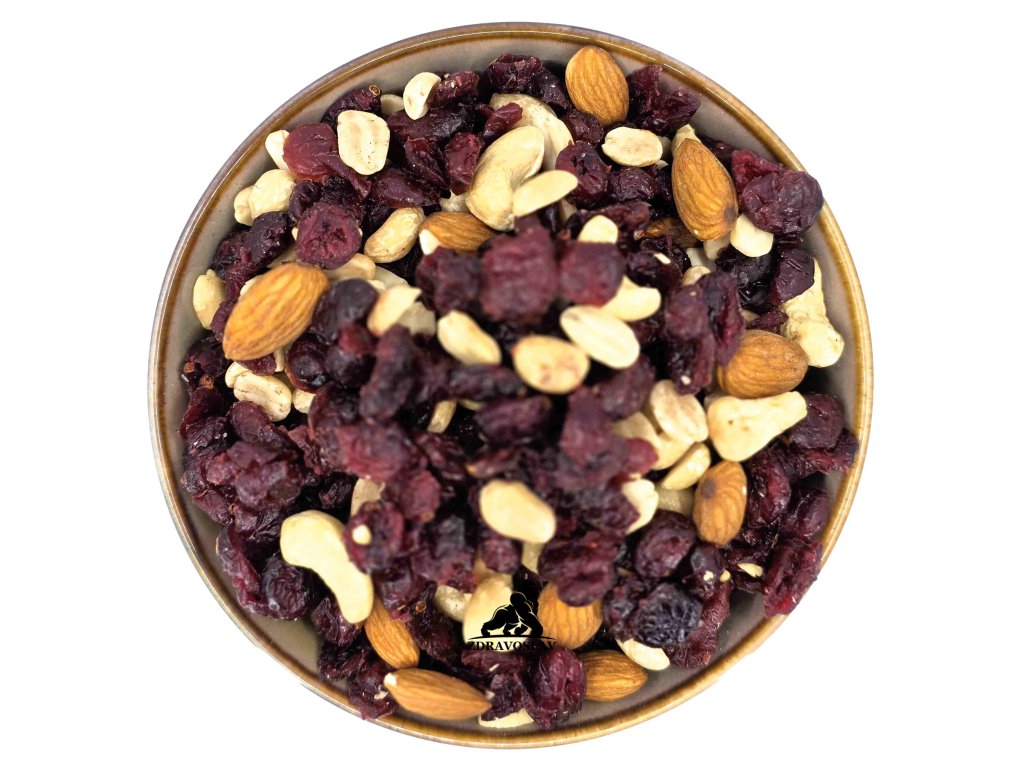 - Sušené ovoce: Mix zahrnuje brusinky, tmavé rozinky přinášející sladkou chuť a bohatost na antioxidanty.