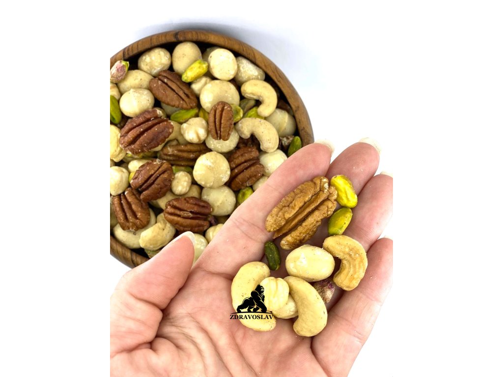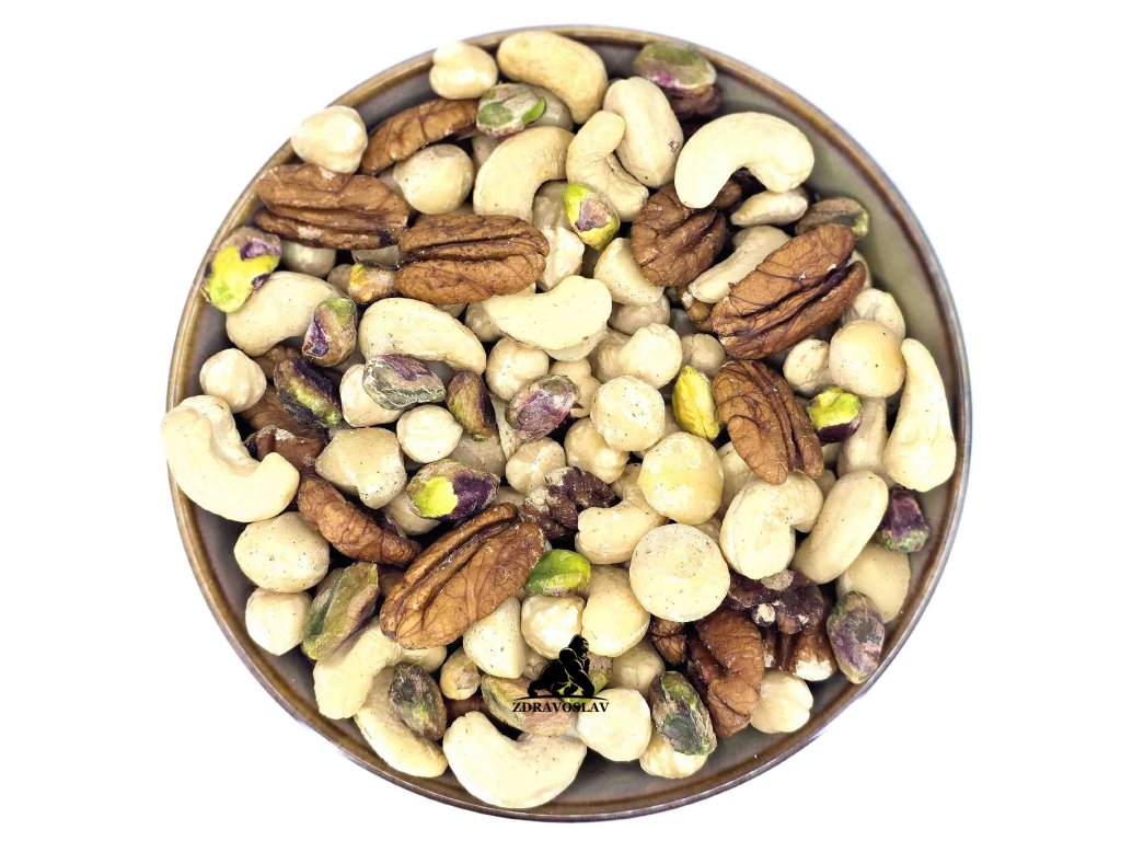 Naše luxusní ořechová směs je jako shromáždění hvězd mezi ořechy! Tato směs obsahuje makadamové ořechy, pekanové ořechy, loupané pistácie a kešu oříšky - vybrané pro jejich vynikající kvalitu a křupavost.