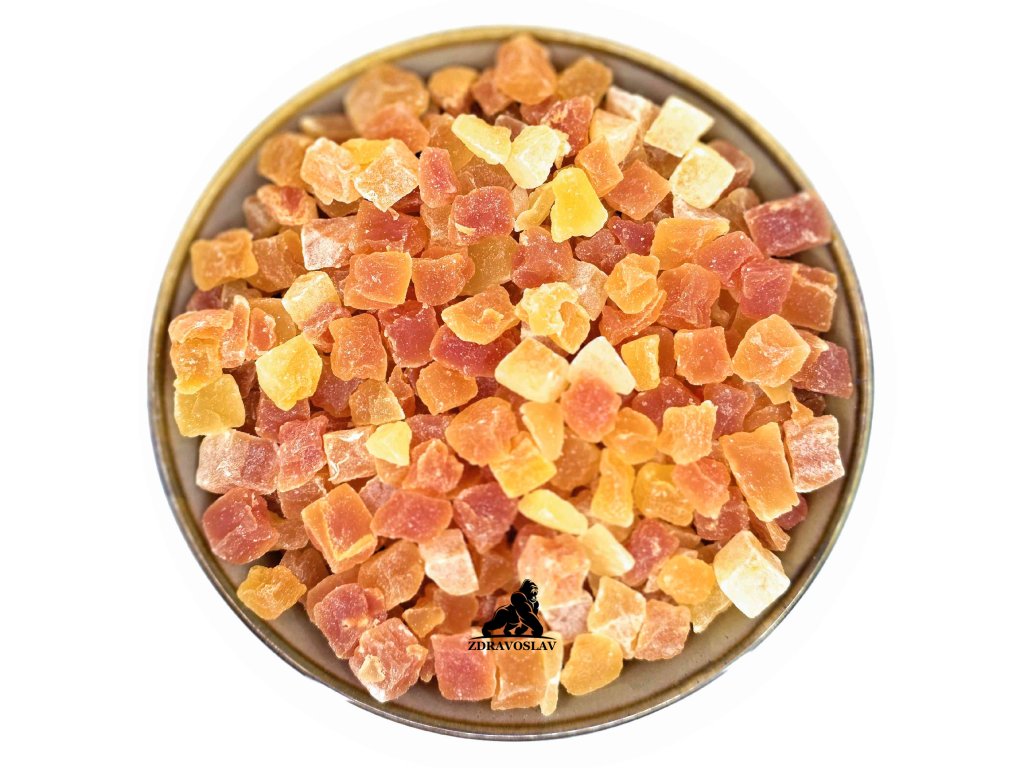 Kandovaná kostka papáje představuje exotickou pochoutku, která přináší slunce tropů přímo na váš stůl. Díky své nasládlé chuti je ideální pro ty, kdo touží po zdravé a chutné svačince. Papája je známá pro svůj bohatý obsah vlákniny a betakarotenu, díky čemuž je výbornou volbou pro doplnění energie během dne.