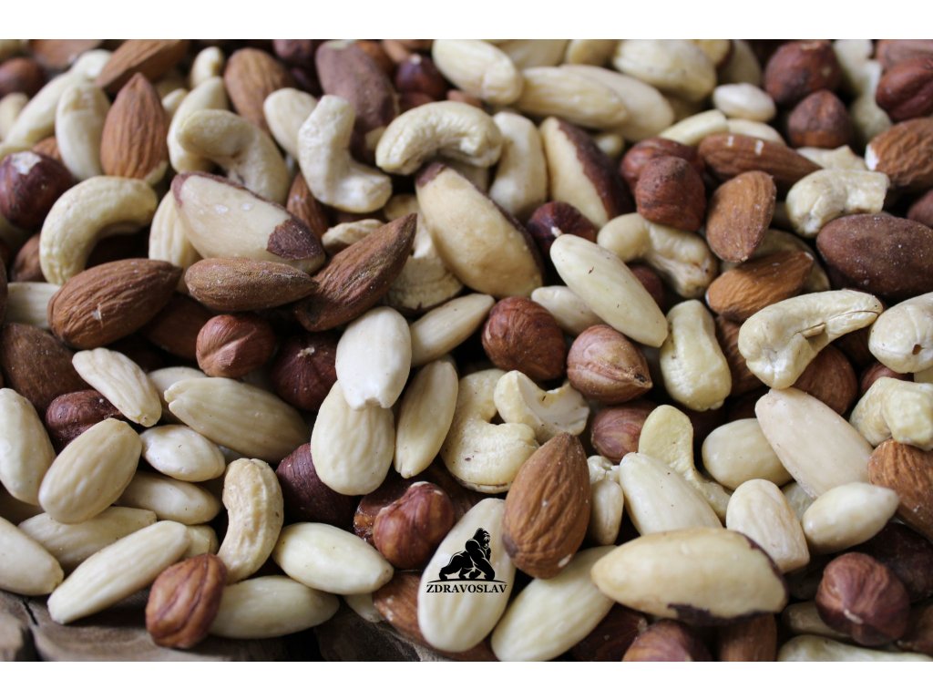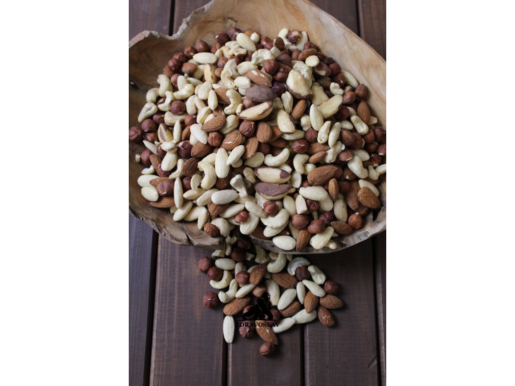 Složení: Mandle jádra natural 21 % (USA, Španělsko), Lísková jádra 25 % (Gruzie), Mandle jádra loupaná 25 % (USA, Španělsko), Kešu jádra ww320 21 % (Indie), Para 8 % (Bolívie)