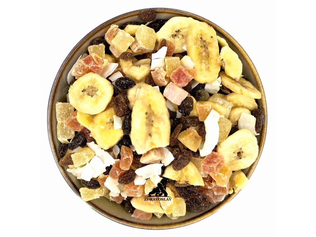 Složení: Ananas (Thajsko), Rozinky (Turecko), Banán chips (Filipíny), Papája (Thajsko), Kokos Chips ( Srí lanka), Slunečnicový olej, med, Kokosový olej, Med, konzervant: oxid siřičitý, Regulátor kyselosti: kyselina citronová.
